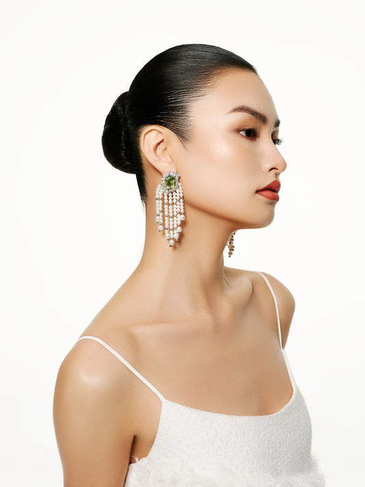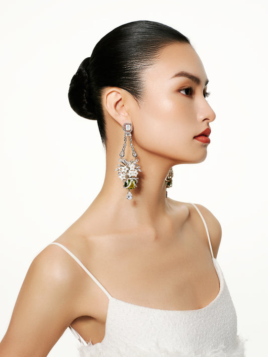 Mother-of-pearl Floral Inlays with Green Crystal Chandelier Earrings
