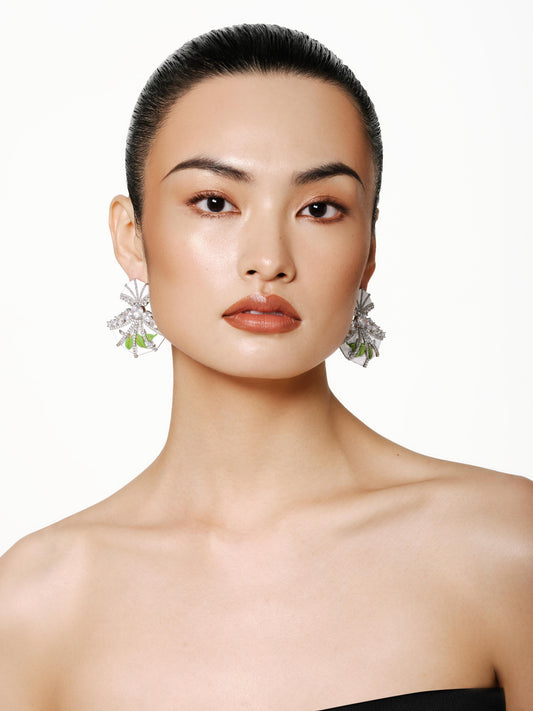 White Fan-shaped Enamel Adorned Vine Crystal Earrings